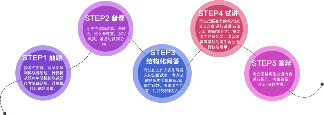 考生按照准备的教案(或活动方案)进行试讲(或演示)。时间10分钟。 备课室备完课后,考生可以携带教案(活动演示方案)、试题清单和准考证去面试室。一般考生答辩后要将教案(活动演示方案)呈交给面试考官再离开教室。 注意:考生面试试讲过程须按照“讲课”形式进行,“说课”形式不予给分。