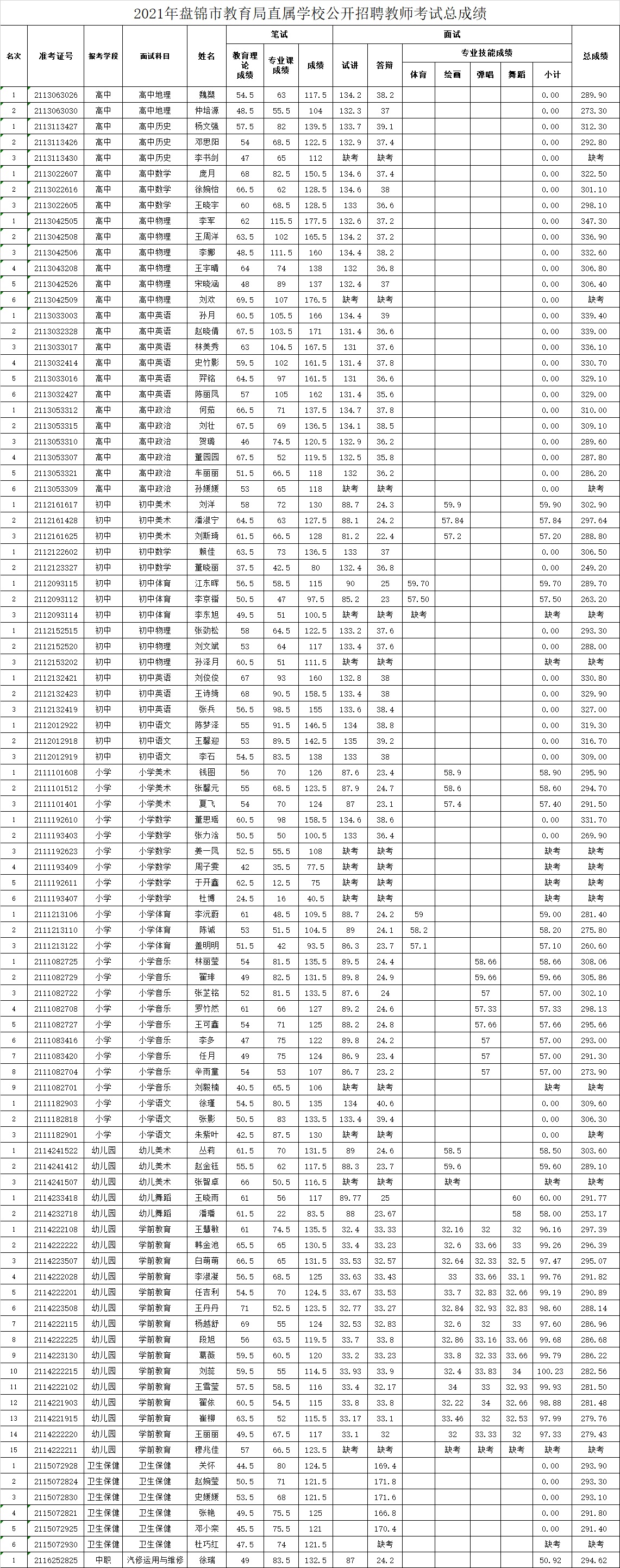 按照2021年盘锦市教育局直属学校教师招聘考试工作流程,现将2021年盘锦市教育局直属学校教师招聘考试总成绩公示如下,并按照招聘的岗位需求数量标明提档人员。因时间紧迫,以免登分过程出现失误,若公布的成绩与考生在考场签字确认的成绩有误,请考生及时与我们联系。若提档人员弃权或资格审查不合格,则公布顺位补录名单。为方便考生及时办理后续相关手续,现将有关事宜通知如下: