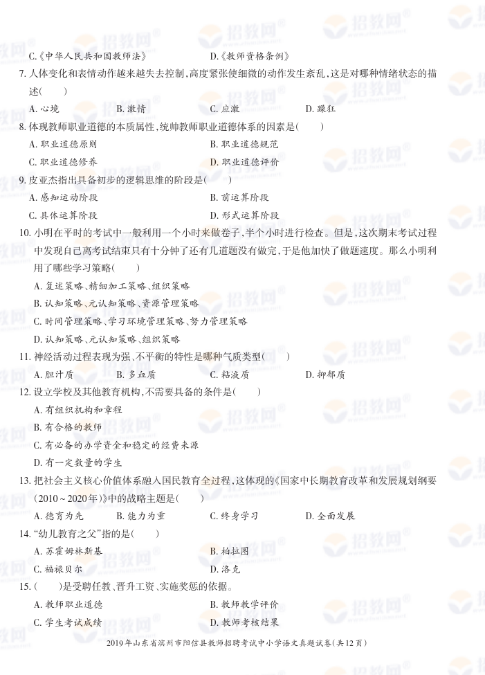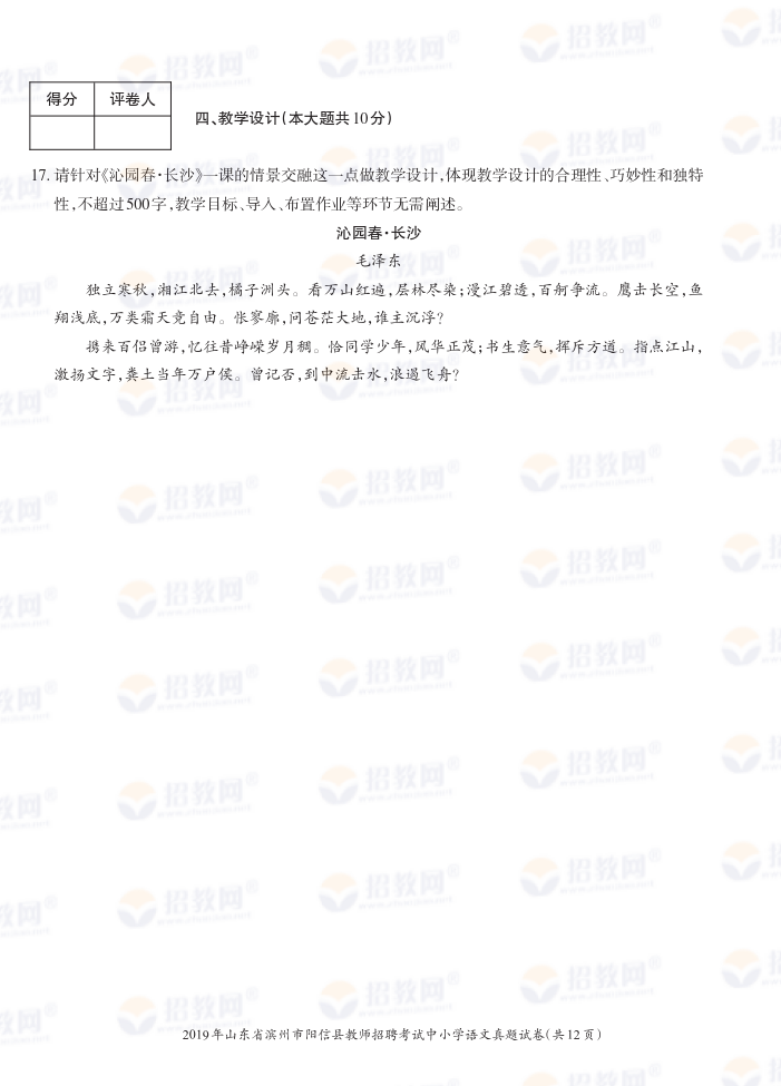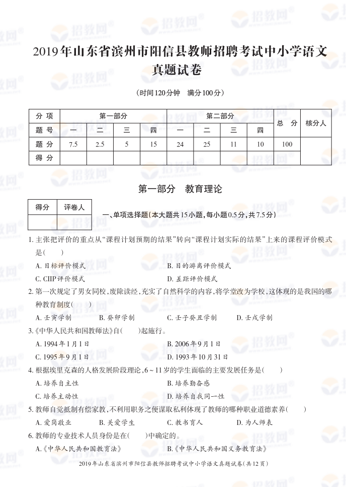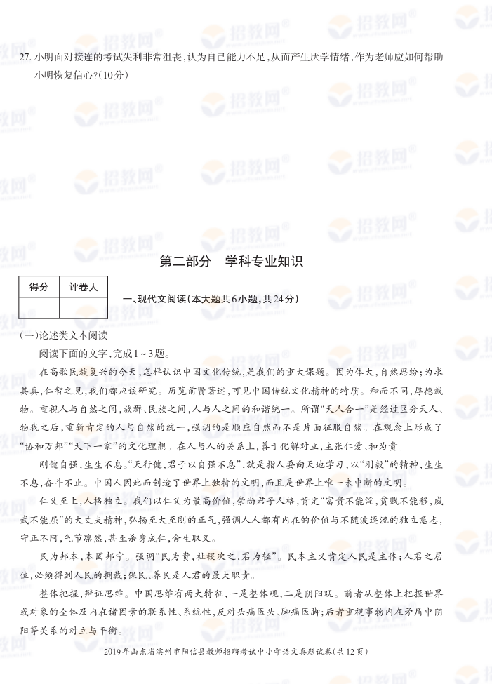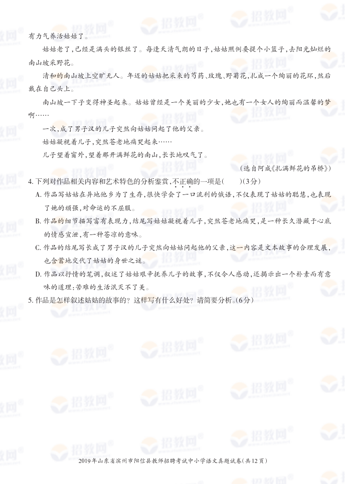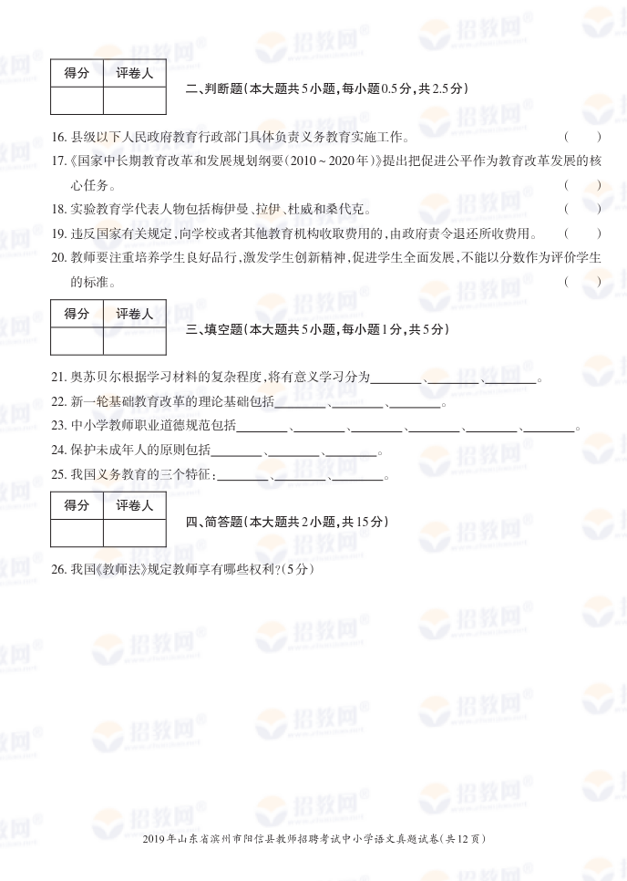 2019年山东滨州市阳信县教师招聘考试中小学语文试题试卷及答案解析-威尼斯5994