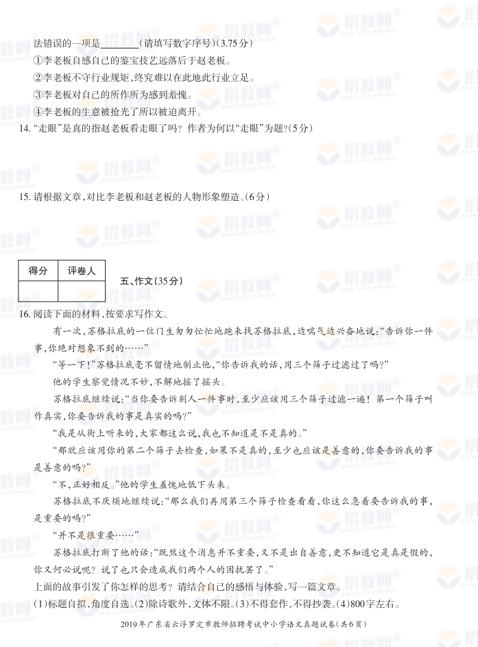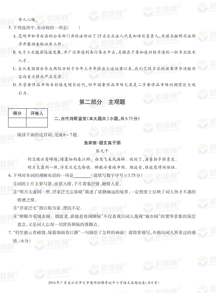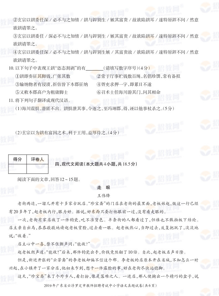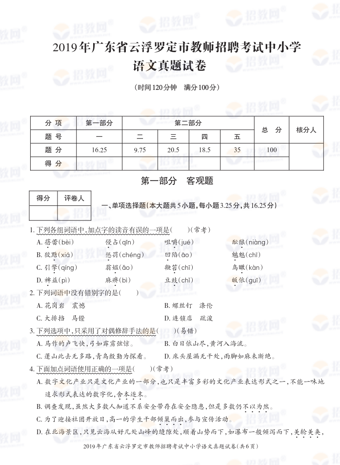 2019年广东省云浮罗定市教师招聘考试中小学语文试题试卷及答案解析-威尼斯5994