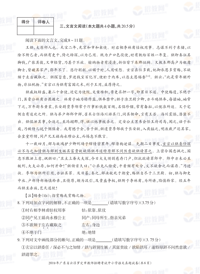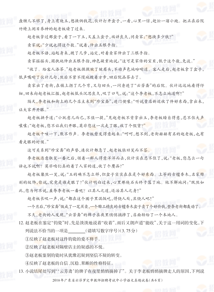 2019年广东省云浮罗定市教师招聘考试中小学语文试题试卷及答案解析