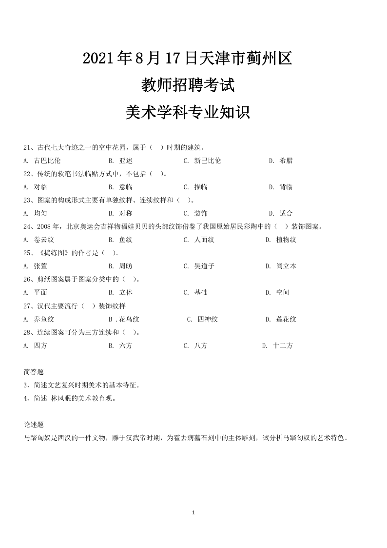 2021年天津市蓟州区教师招聘考试美术部分试题及答案解析-威尼斯5994