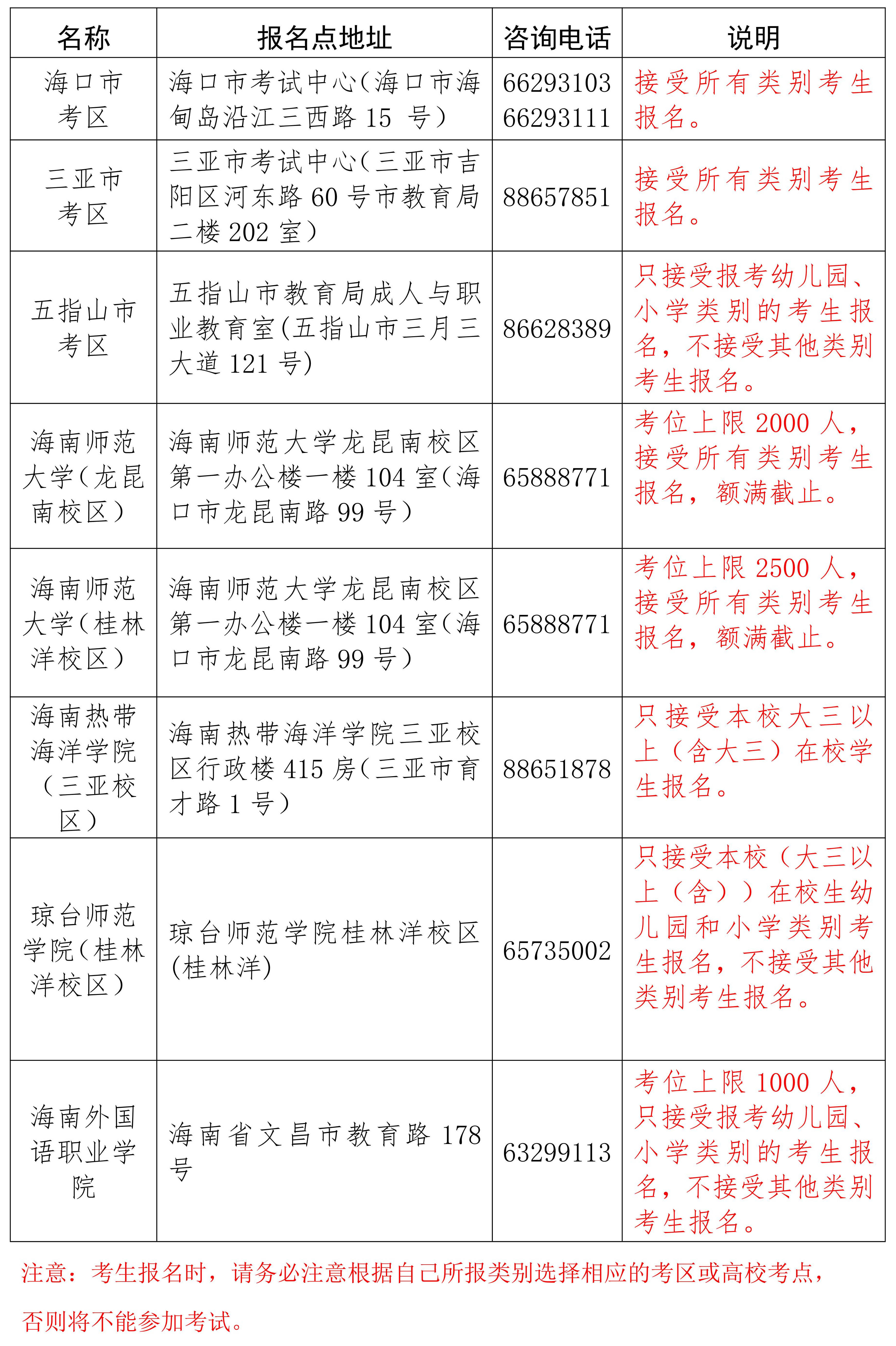 我省共设海口市、三亚市、五指山市等3个考区和海南师范大学(龙昆南校区、桂林洋校区)、海南热带海洋学院(三亚校区)、琼台师范学院(桂林洋校区)和海南外国语职业学院等4所高校考点,报名结束后海口市、三亚市、五指山市等3个考区根据实际报名情况设置中学考点,考生参加考试的考点名称和地址以准考证上的为准。现将考区和高校考点信息公布如下: