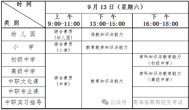 注:1.申请中等职业学校文化课教师资格的人员参加高级中学教师资格考试。申请中等职业学校专业课和实习指导教师资格人员,参加高级中学教师资格考试笔试“综合素质”和“教育知识与能力”两科考试。根据青海省教育厅《关于印发青海省中小学教师资格考试实施方案(试行)的通知》(青教师〔2015〕69号)第四部分第(二)款4条的规定,中等职业学校专业课教师和实习指导教师笔试科目《专业知识与教学能力》暂不笔试,主要结合面试教学考查,有关事宜另行通知。