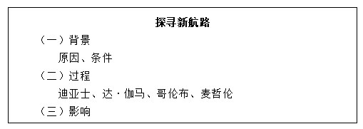 导入之后进入一堂课的核心部分,也就是新课教学的内容。为了让学生更好的把握知识体系,我对三个子目的知识进行了整合,按照探寻新航路的背景、过程和影响三个环节加以展开。
